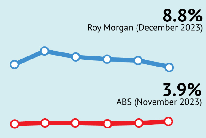 Roy Morgan’s unemployment figure of 8.8% is more than double the ABS estimate of 3.9% for November but is comparable with the combined ABS unemployment and under-employment figure of 10.4%.