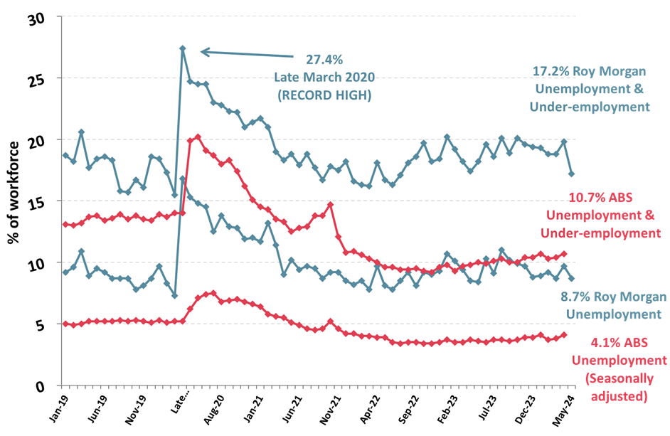 Roy Morgan’s unemployment figure of 9.7% is more than double the ABS estimate of 4.1% for April but is approaching the combined ABS unemployment and under-employment figure of 10.7%.
