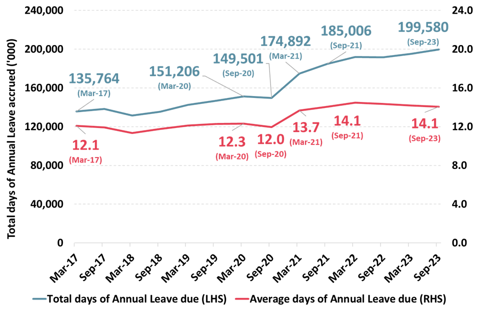“Since September 2021 the average days of annual leave accrued has stayed constant at 14.1 days but the overall level of accrued annual leave has increased as the workforce has rapidly expanded during the last two years.