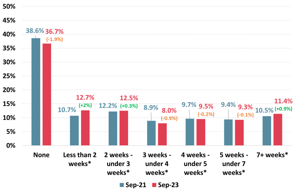 Source: Roy Morgan Single Source, Oct. 2020 – Sept. 2021, n=35,510, Oct. 2022 – Sept. 2023, n=39,991. Base: Australians 14+ in paid employment. *Annual leave owed is calculated based on (working) days owed. Less than 2 weeks: 1-9 days; 2 weeks – under 3 weeks: 10-14 days; 3 weeks – under 4 weeks: 15-19 days; 4 weeks – under 5 weeks: 20-24 days; 5 weeks – under 7 weeks: 25-34 days; 7+ weeks: 35+ days.