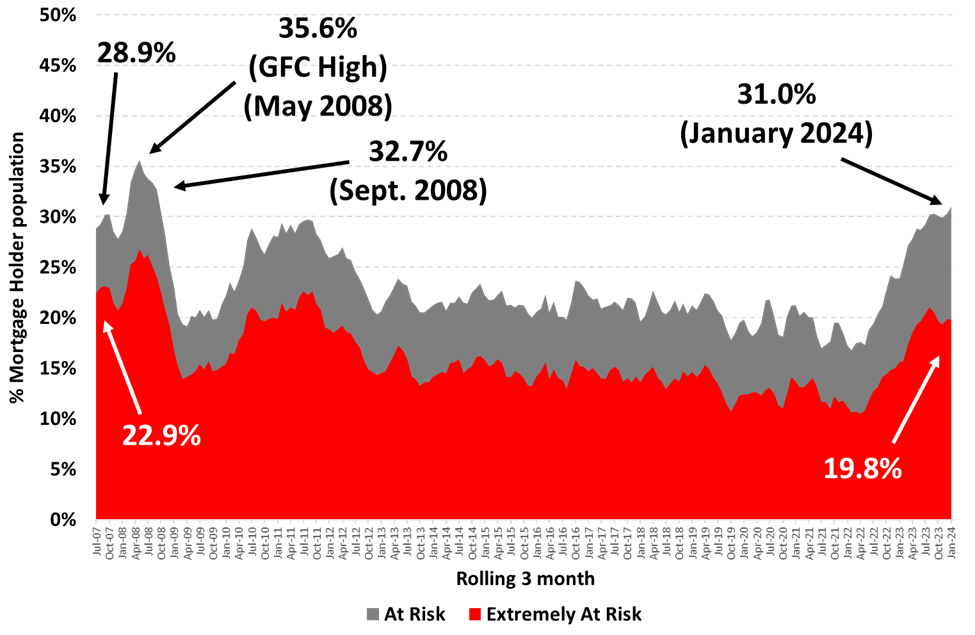 The figure for January represented a new record high total for mortgage holders considered ‘At Risk’ of mortgage stress, beating the previous record highs above 1.56 million in August and September 2023.