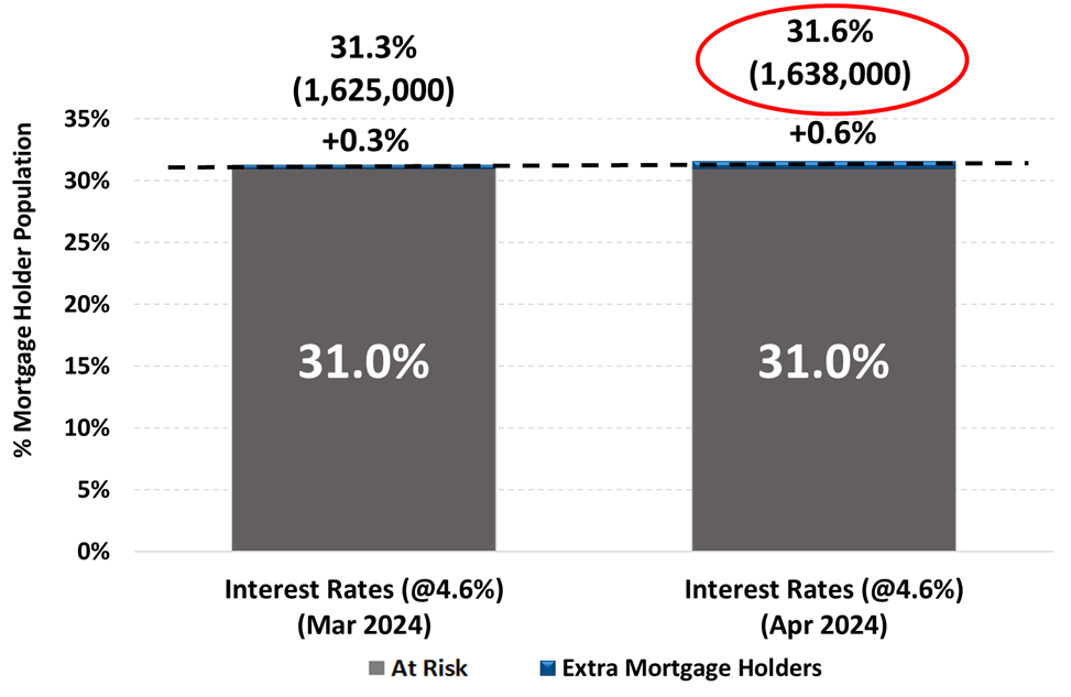 This number will increase further to 31.6% (up 0.6% points) of mortgage holders, 1,638,000, considered ‘At Risk’ in April 2024 – an increase of 29,000 on January 2024.