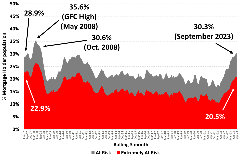 “Of even more concern is the rise in mortgage holders considered ‘Extremely At Risk’, now estimated at 1,043,000 in September 2023. This figure has more than doubled since the RBA began raising interest rates, representing an increase of over 560,000 mortgage holders.