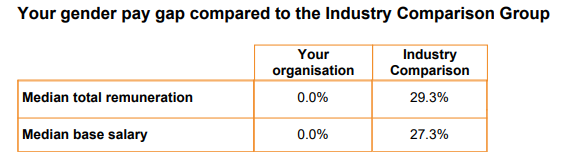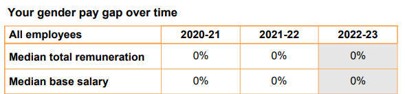 The ‘median base salary gender pay gap’ is also at 0.0% compared to an industry average of 27.3%.