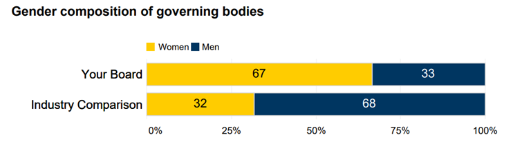 Roy Morgan’s board also outperforms the industry comparison when it comes to representation of women. Women comprise a clear majority of 67% of Roy Morgan’s board – more than double the average of our industry peers at only 32%.
