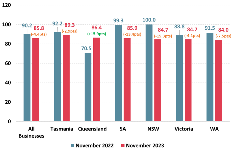 Business Confidence for the month of November is not only down on a month ago (by 4.6pts to 85.8), but is also down compared to a year ago, down by 4.4pts since November 2022.
